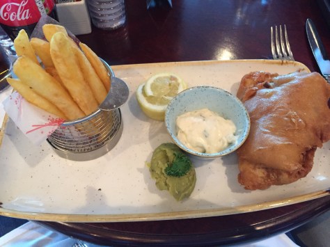 Emma got a lovely baked Cumberland sausage with an onion gravy, set in a bed of bubble and squeak (cabbage and mashed potatoes) I got fish and chips…the chops there were a far lovelier cut of potato than the fries served elsewhere on board, I loved them.