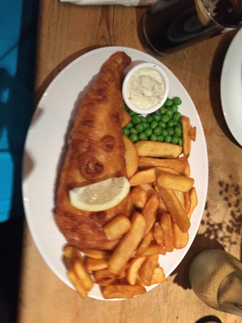 E had a potato and leek soup, chips, and a sticky toffee pudding with custard and ice cream. Bill had a proper Sunday roast and a pint. I had fish and chips.