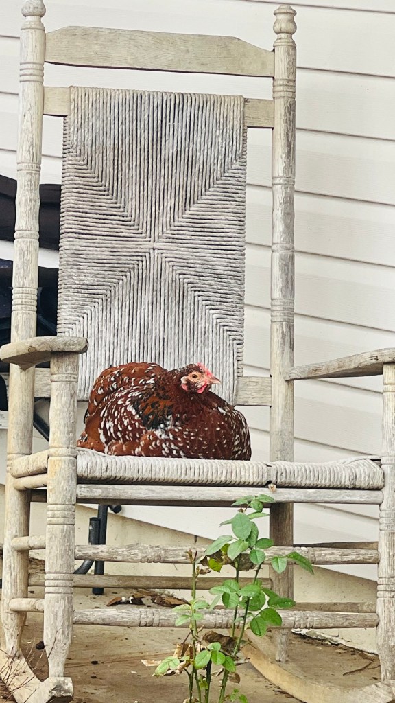 I’m sat in my yard, in my favourite chair, I’ve spent a bit of time with my bare feet on the wet mushy ground, the cold wetness hugging my feet as I ‘ground’ myself. I’m listening to Redbirds chirping and the sound of an extremely distant delivery truck backing up and a dog barking half a mile away. The breeze rustles the dead leaves in the trees above me and the ferns clinging to the branches of the tree to my left, and the hairs on my arm which are stood on end because of the briskness of the air. There is a plane somewhere in the distance, an old bomber by the sounds of it, ambling its way invisibly along the horizon. My chickens have finally decided the hawks overhead are a threat, perhaps…or perhaps someone has simply laid a late afternoon egg and has shared the joy with half my flock…who knows?